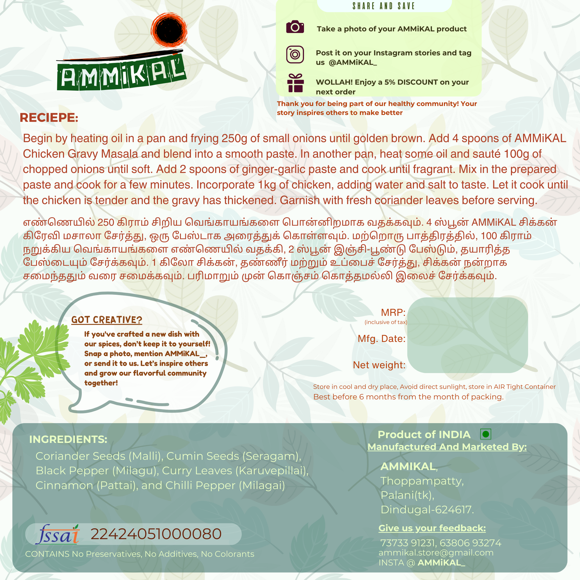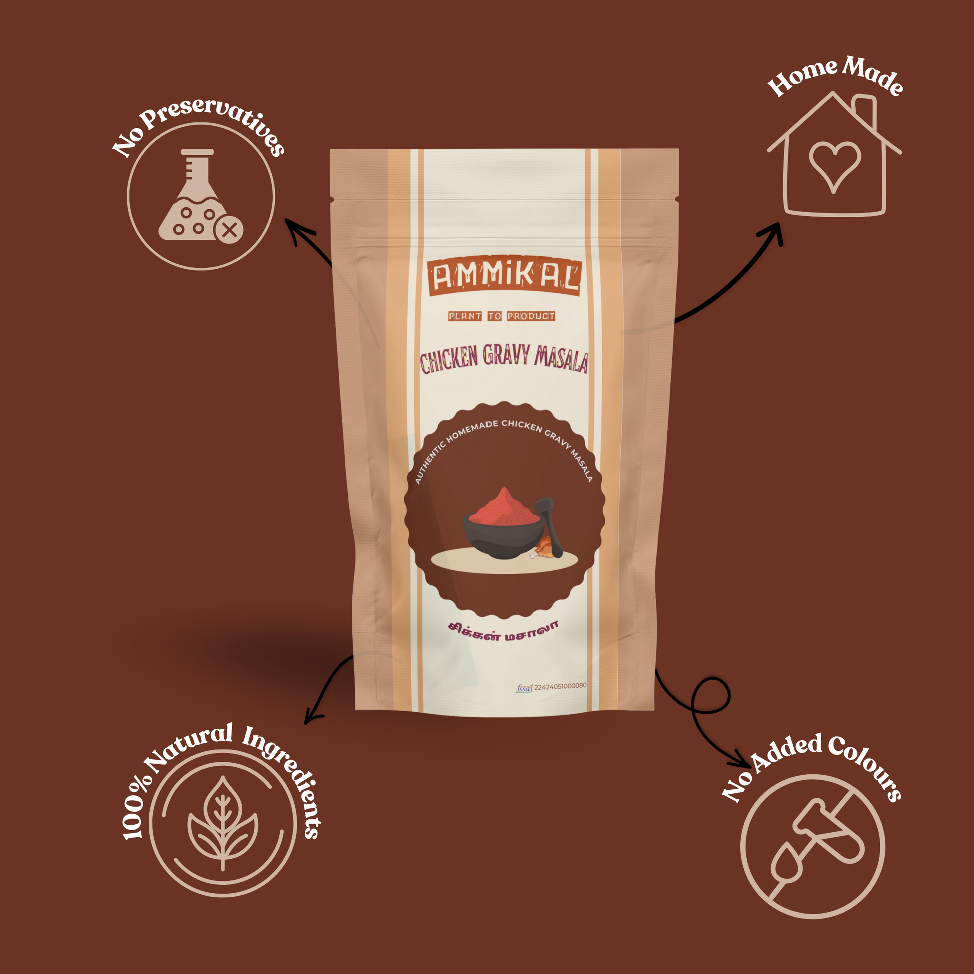 Whether it’s a quick weekday curry or a Sunday family feast, one spoon of AMMiKAL Chicken Gravy Masala brings that rich, flavour-packed warmth you’d expect from your favourite restaurant - now made simple at home.